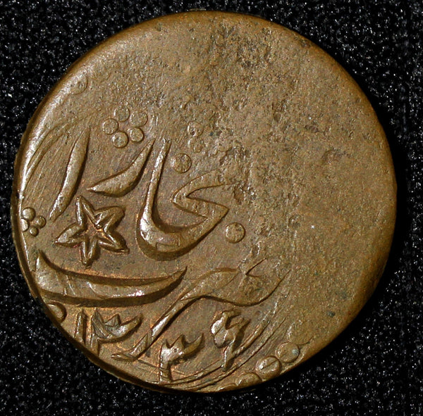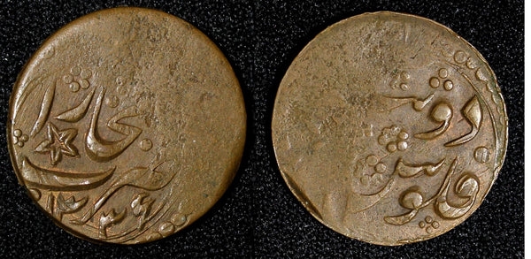 Obverse: Inscription "zarb bukhara" with a star and the date within a circle of dots.Reverse: Inscription "fulus du tangah" inside a circle of dots.