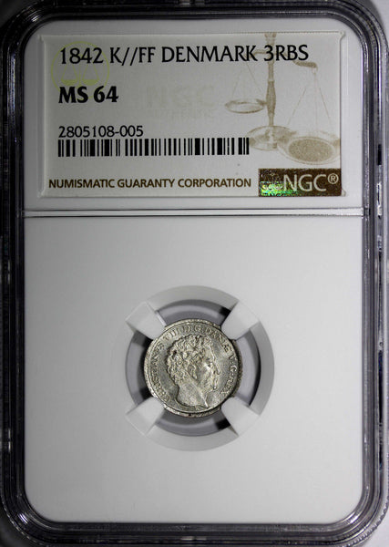 Denmark Christian VIII (1839-1848) Silver 1842 K//FF 3 Rigsbankskilling GRADED NGC MS64 ONE YEAR TYPE KM# 729 Obverse: Head right Reverse: Crown above crossed sword and scepter, denomination spelled out YOU WILL RECEIVED THE SAME COIN AS PICTURED. ALL COINS ARE AUTHENTIC AS DESCRIBED.