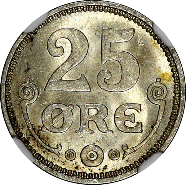 Denmark . Christian X Silver 1913 VBP GJ 25 Ore GRADED NGC MS64 KM# 815.1 Obverse: Crowned CX monogram, initials VBP and mint mark lower left, date and initials GJ lower right Reverse: Value, ornaments flanking Please check out my other listings and we will be happy to combine in one package ! YOU WILL RECEIVED THE SAME COIN AS PICTURED. ALL COINS ARE AUTHENTIC AS DESCRIBED.