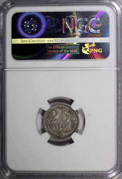 DENMARK Christian X SILVER 1917 25 Øre GRADED NGC AU58 WWI Issue SCARCE DATE KM# 815.1 Obverse: Crowned CX monogram, initials VBP and mint mark lower left, date and initials GJ lower right Reverse: Value, ornaments flanking YOU WILL RECEIVED THE SAME COIN AS PICTURED. ALL COINS ARE AUTHENTIC AS DESCRIBED.