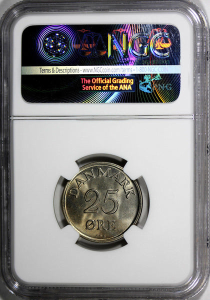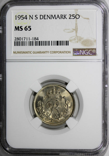 DENMARK Frederik IX 1954 N S 25 Ore GRADED NGC MS65 LIGHT TONING 23mm KM# 842.1 Obverse: Crowned FIXR monogram divides value, oak and beech branches below Reverse: Value, country name, mint mark, initials N-S YOU WILL RECEIVED THE SAME COIN AS PICTURED. ALL COINS ARE AUTHENTIC AS DESCRIBED.