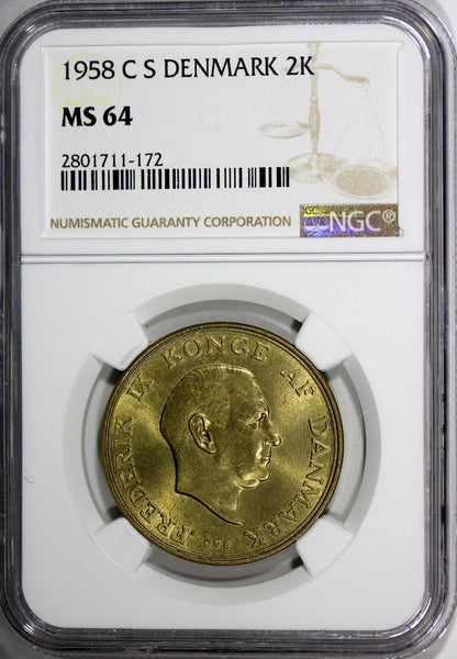 Denmark Frederik IX 1948-1960 1958 C S 2 Kroner GRADED NGC MS64 31mm KM# 838.2 Obverse: Head right, mint mark and initials C-S below Reverse: Crowned royal arms divide date, value above YOU WILL RECEIVED THE SAME COIN AS PICTURED. ALL COINS ARE AUTHENTIC AS DESCRIBED.
