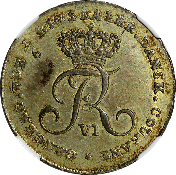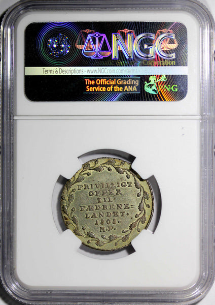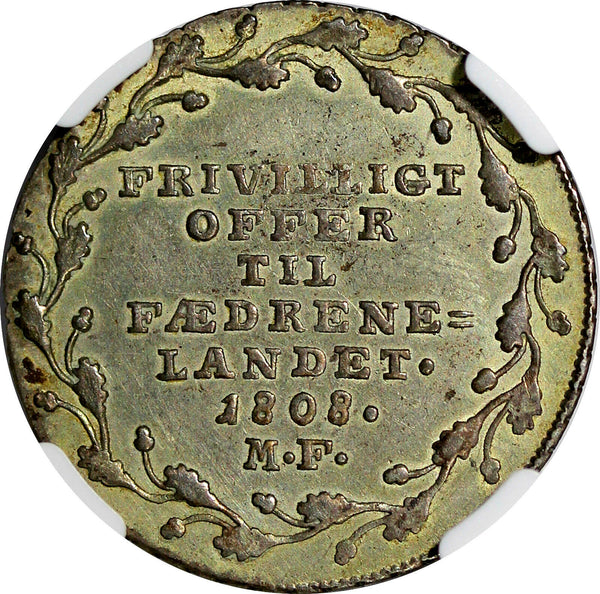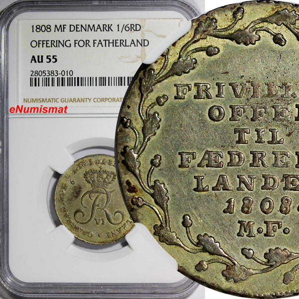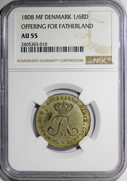 Denmark Frederik VI (1808-1839) Silver 1808-MF 1/6 Rigsdaler GRADED NGC AU55 Offering for Fatherland ALTONA "OPFERMARK" NICE GOLD TONING KM# 664 Obverse: Crowned monogram Obverse Legend: GANGBAR For 1/6 RIGSDALER DANSK COURANT Reverse: Legend within oak wreath Reverse Legend: FRIVILLIGT OFFER TIL FÆDRENE LANDET Edge Description: Small circles YOU WILL RECEIVED THE SAME COIN AS PICTURED. ALL COINS ARE AUTHENTIC AS DESCRIBED.