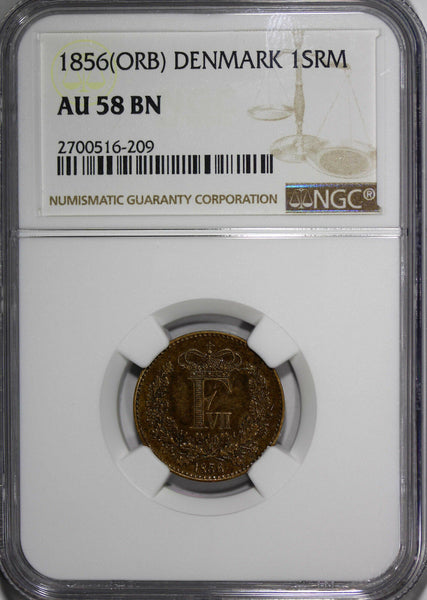 Denmark Frederik VII Bronze 1856 (ORB) 1 Skilling Rigsmont GRADED NGC AU58 BN KM# 763 Obverse: Crowned monogram above oak branches Reverse: Denomination YOU WILL RECEIVED THE SAME COIN AS PICTURED. ALL COINS ARE AUTHENTIC AS DESCRIBED.