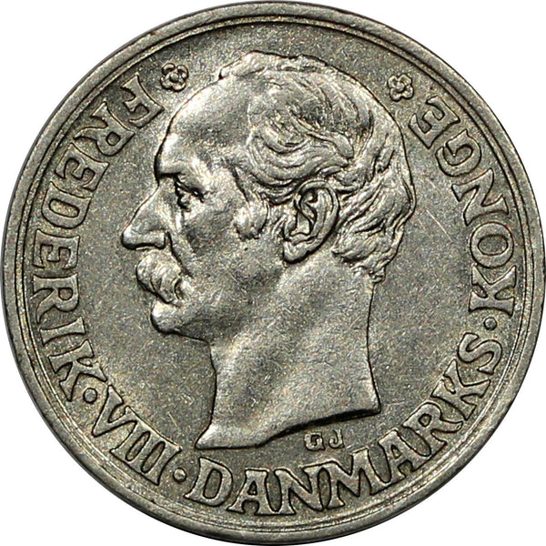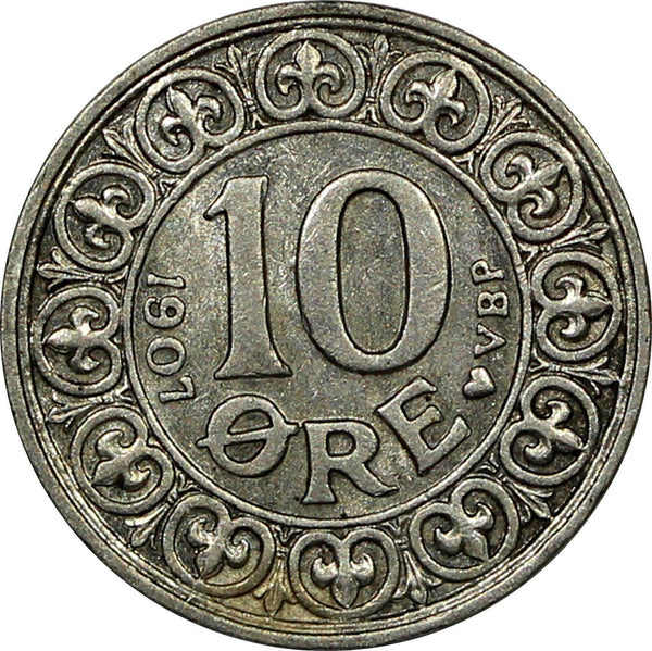 Denmark Frederik VIII Silver 1907 (h) VBP; GJ 10 Ore XF Condition Obverse: Head left, initials GJ below Reverse: Value, date, mint mark, initials VBP within circle, lily ornamentation surrounds KM# 807 YOU WILL RECEIVED THE SAME COIN AS PICTURED. ALL COINS ARE AUTHENTIC AS DESCRIBED. 9694