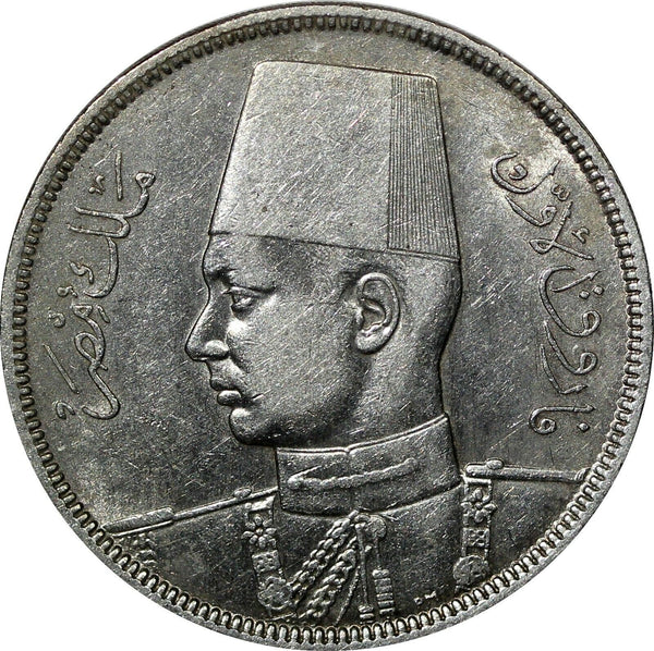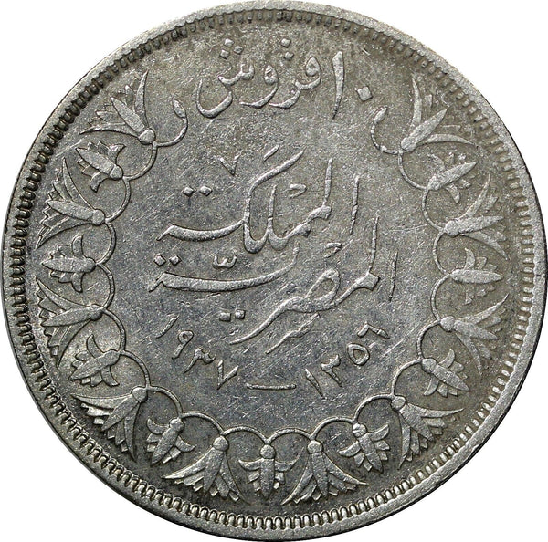 Egypt Farouk Silver AH1356 (1937) 10 Piastres aUnc Condition Diameter 33 mm KM# 367 Obverse: Portrait of King Farouk facing left, wearing hat Reverse:Denomination and dates within tasseled wreath 10 655 Please check out my other listings and we will be happy to combine in one package ! YOU WILL RECEIVED THE SAME COIN AS PICTURED. ALL COINS ARE AUTHENTIC AS DESCRIBED.
