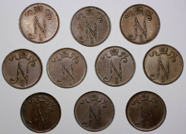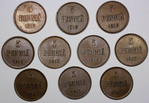 Finland Nicholas II Copper LOT OF 10 COINS 1915 5 Pennia KM# 15