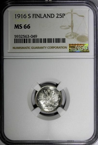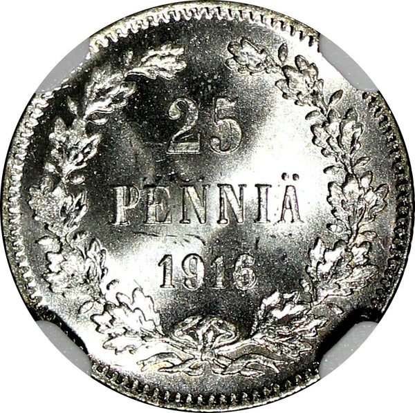 Finland Nicholas II Silver 1916 S 25 Pennia NGC MS66 GEM BU KM #6.2 (049)