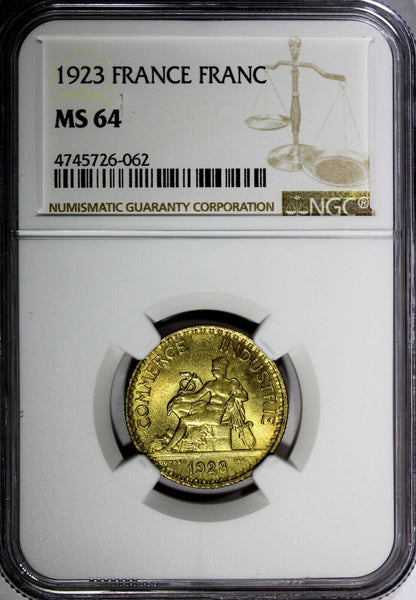 France Aluminum-Bronze 1923 1 Franc GRADED NGC MS64 GAD-468 KM# 876 Obverse: Value Obverse Legend: CHAMBRES • DE • COMMERCE • DE • FRANCE Reverse: Mercury seated left Reverse Legend: COMMERCE - INDUSTRIE Edge Description: Reeded Please check out my other listings and we will be happy to combine in one package ! YOU WILL RECEIVED THE SAME COIN AS PICTURED. ALL COINS ARE AUTHENTIC AS DESCRIBED.
