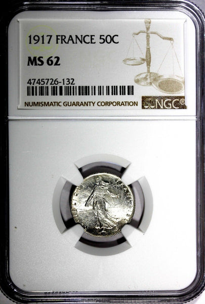 FRANCE Silver 1917 50 Centimes GRADED NGC MS62 NICE TONED KM# 854 Obverse: Figure sowing seed Reverse: Leafy branch divides date and denomination Edge Description: Reeded Please check out my other listings and we will be happy to combine in one package ! YOU WILL RECEIVED THE SAME COIN AS PICTURED. ALL COINS ARE AUTHENTIC AS DESCRIBED.