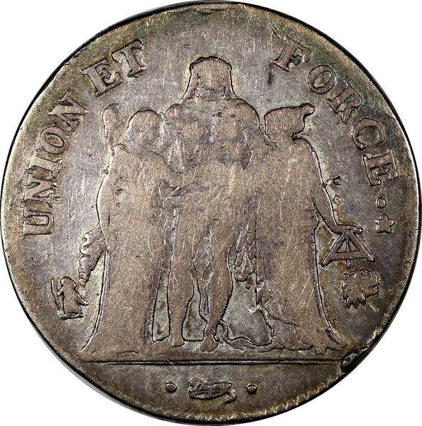 France SILVER LAN 7 (1798-99) L 5 Francs BAYONNE MINT.LOW MINTAGE-419,000 SCARCE KM# 639.6 Obverse: Hercules group Obverse Legend: UNION ET FORCE Reverse: Value within oak wreath Reverse Legend: REPUBLIQUE FRANCAISE Please check out my other listings and we will be happy to combine in one package ! YOU WILL RECEIVED THE SAME COIN AS PICTURED. ALL COINS ARE AUTHENTIC AS DESCRIBED. 11 029