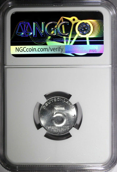 Germany - Democratic Republic Aluminum 1953 A 5 Pfennig GRADED NGC MS65 KM# 6 Obverse: Denomination Reverse: Grain sprigs flank hammer and protractor, date below Please check out my other listings and we will be happy to combine in one package ! YOU WILL RECEIVED THE SAME COIN AS PICTURED. ALL COINS ARE AUTHENTIC AS DESCRIBED.