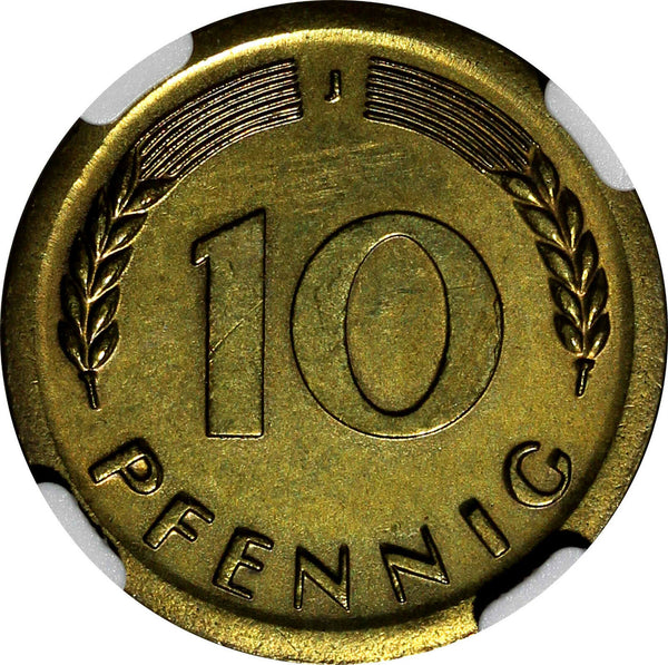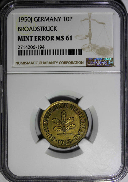 Germany Federal Republic Brass Clad Steel 1950-J 10 Pfennig GRADED NGC MINT ERROR MS61 BROADSTRUCK KM# 108 Obverse: Five oak leaves, date below Obverse Legend: BUNDESREPUBLIK DEUTSCHLAND Reverse: Denomination Edge Description: Plain YOU WILL RECEIVED THE SAME COIN AS PICTURED. ALL COINS ARE AUTHENTIC AS DESCRIBED.