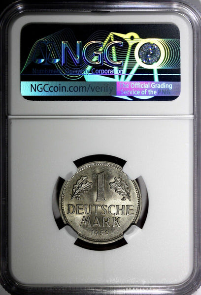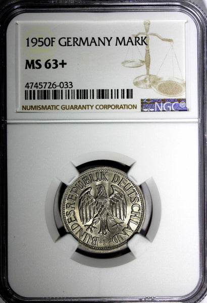 Germany-Federal Republic 1950 F 1 Mark GRADED NGC MS63+ "PLUS" Stuttgart Mint KM# 110 Obverse: Eagle Reverse: Denomination flanked by oak leaves, date below Please check out my other listings and we will be happy to combine in one package ! YOU WILL RECEIVED THE SAME COIN AS PICTURED. ALL COINS ARE AUTHENTIC AS DESCRIBED.