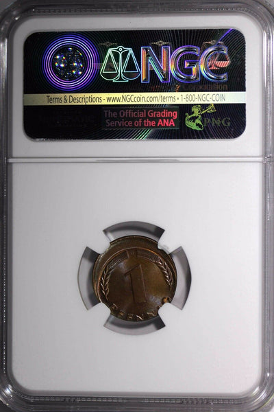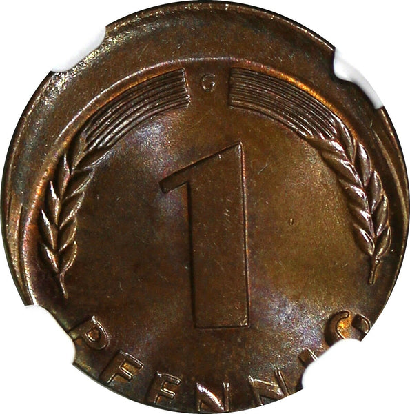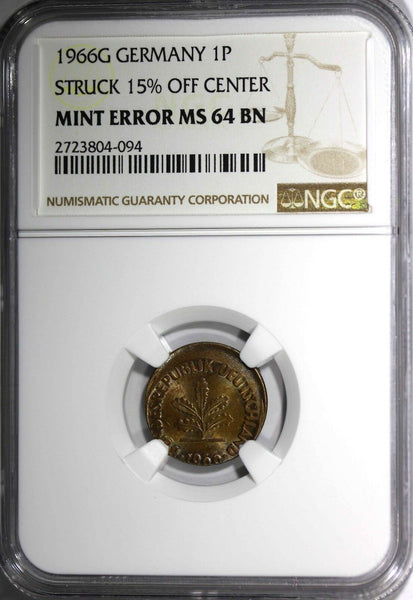 Germany - Federal Republic 1966-G 1 Pfennig MINT ERROR STRUCK 15% OFF CENTER GRADED NGC MS64 BN KM# 105 Obverse: Five oak leaves, date below Obverse Legend: BUNDESREPUBLIK DEUTSCHLAND Reverse: Denomination YOU WILL RECEIVED THE SAME COIN AS PICTURED. ALL COINS ARE AUTHENTIC AS DESCRIBED.