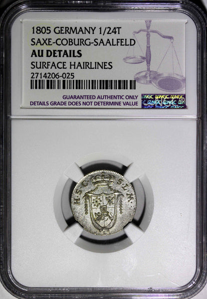 German States SAXE-COBURG-SAALFELD Franz Friedrich Anton (1800-1806) Silver 1805 1/24 Thaler GRADED NGC AU DETAILS Low Mintage-195,758 RARE.1 YEAR TYPE. Surface Hairlines KM# 130 Obverse: Crowned elongated shield of 4-fold arms, with central shield of ducal Saxony, in ornamental frame, legend divided to upper left and right Obverse Legend: H. S. C. - S. L. M. Reverse: 4-line inscription with date Reverse Inscription: 24 / EINEN / THALER / (date)