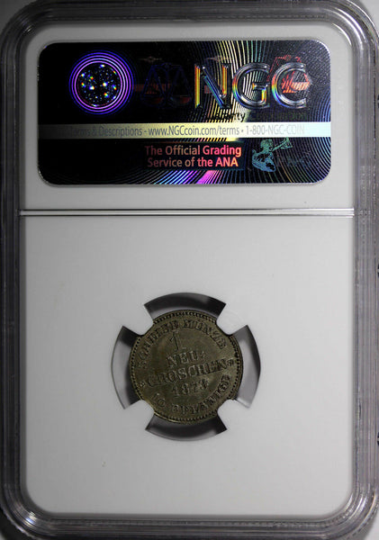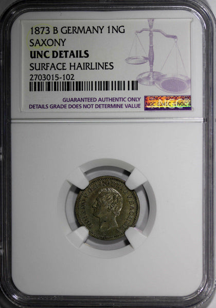 German States SAXONY-ALBERTINE Johann Silver 1873-B Neu-Groschen GRADED NGC UNC DETAILS Surface Hairlines LAST YEAR TYPE.LOW MINTAGE- 420,000 KM# 1221 Obverse: Head left Reverse: Denomination above date YOU WILL RECEIVED THE SAME COIN AS PICTURED. ALL COINS ARE AUTHENTIC AS DESCRIBED.