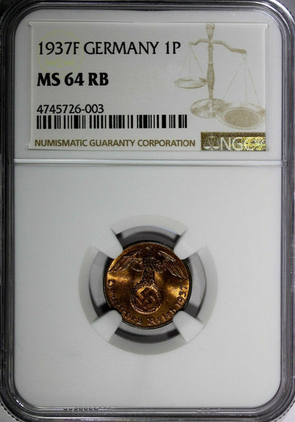GERMANY-Third Reich Bronze 1937 F 1 Reichspfennig GRADED NGC MS64 RB TOP GRADED COIN BY NGC KM# 89 Obverse: Eagle above swastika within wreath Reverse: Denomination, oak leaves below Please check out my other listings and we will be happy to combine in one package ! YOU WILL RECEIVED THE SAME COIN AS PICTURED. ALL COINS ARE AUTHENTIC AS DESCRIBED.