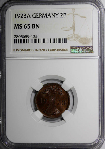 GERMANY, Weimar Republic Bronze 1923-A 2 Rentenpfennig GRADED NGC MS65 BN TOP GRADED COIN BY NGC FIRST YEAR FOR THE TYPE KM# 31 Obverse: Denomination within circle Reverse: Wheat sheaf divides date YOU WILL RECEIVED THE SAME COIN AS PICTURED. ALL COINS ARE AUTHENTIC AS DESCRIBED.