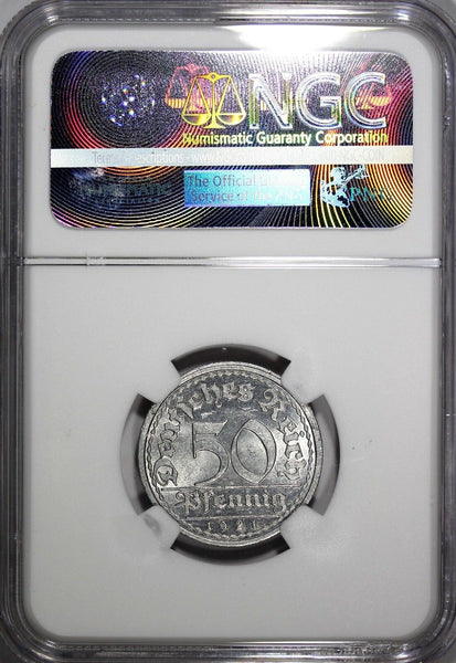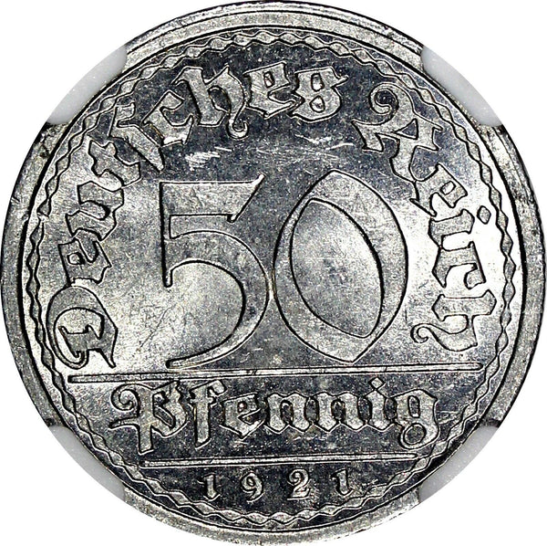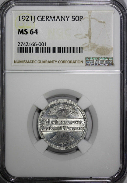 Germany,Weimar Republic 1921 J 50 Pfennig GRADED NGC MS64 ONLY 1 CON GRADED HIGHEST BY NGC Weight: 1.6000g Diameter: 23mm KM# 27 Obverse: Denomination above date Reverse: Sheaf behind inscription Edge Description: Reeded Please check out my other listings and we will be happy to combine in one package ! YOU WILL RECEIVED THE SAME COIN AS PICTURED. ALL COINS ARE AUTHENTIC AS DESCRIBED.