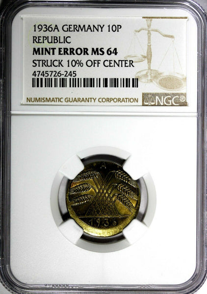 Germany-Weimar Republic Aluminum-Bronze 1936 A 10 Reichspfennig GRADED NGC MINT ERROR MS64 STRUCK 10% OFF CENTER KM# 40 Obverse: Denomination within square, oak leaf on each side Reverse: Six grain sprigs form center triangle above date Please check out my other listings and we will be happy to combine in one package ! YOU WILL RECEIVED THE SAME COIN AS PICTURED. ALL COINS ARE AUTHENTIC AS DESCRIBED.