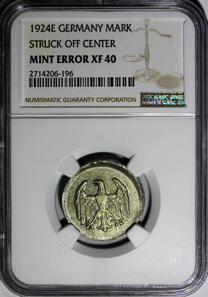Germany - Weimar Republic Silver 1924-E 1 Mark GRADED NGC MINT ERROR XF40 ERROR-STRUCK OFF CENTER SCARCE DATE KM# 42 Obverse: Denomination above date Reverse: Eagle YOU WILL RECEIVED THE SAME COIN AS PICTURED. ALL COINS ARE AUTHENTIC AS DESCRIBED.