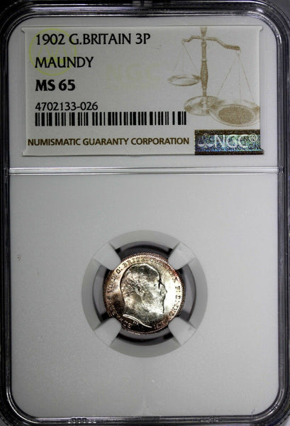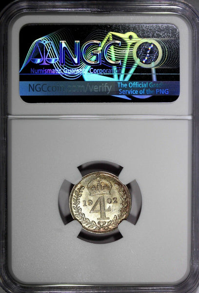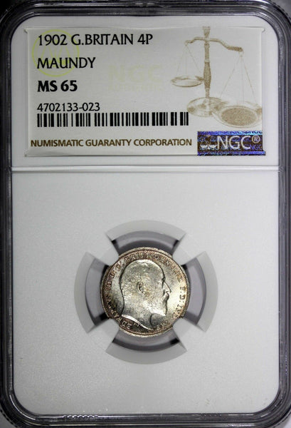 GREAT BRITAIN Edward VII Silver 1902 Maundy Set (4 Coin) 4 PENCE-NGC MS65 KM#798 3 PENCE -NGC MS65 KM#797 2 PENCE-NGC MS66 KM#796 3 PENCE -NGC MS66 KM#795 NICE TONING .MINTAGE-8,976 Please check out my other listings and we will be happy to combine in one package ! YOU WILL RECEIVED THE SAME COIN AS PICTURED. ALL COINS ARE AUTHENTIC AS DESCRIBED.