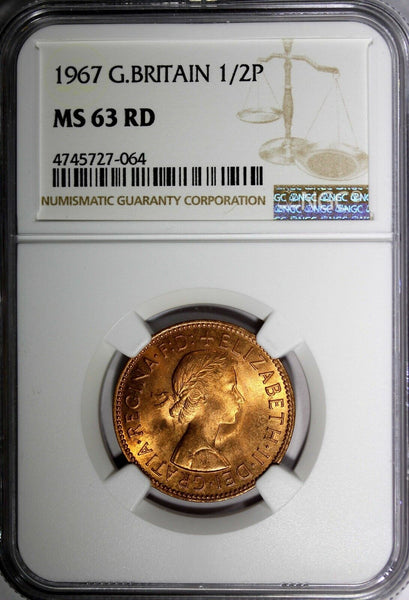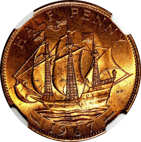 GREAT BRITAIN Elizabeth II BRONZE 1967 1/2 Penny GRADED NGC MS63 RD FULL RED KM# 896 Obverse: Laureate bust right Obverse Legend: Without BRITT OMN Reverse: The Golden Hind Edge Description: Plain Please check out my other listings and we will be happy to combine in one package ! YOU WILL RECEIVED THE SAME COIN AS PICTURED. ALL COINS ARE AUTHENTIC AS DESCRIBED.
