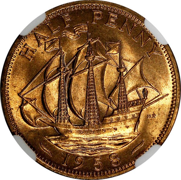 Great Britain Elizabeth II Bronze 1958 1/2 Penny NGC MS64 RD FULL RED KM#896 (2)