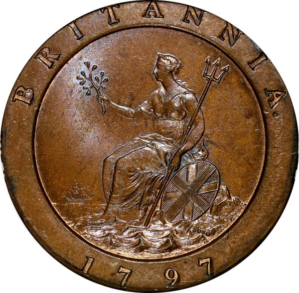 Reverse: Seated figure of Britannia facing left, trident in left hand, olive