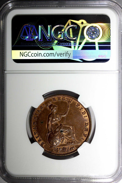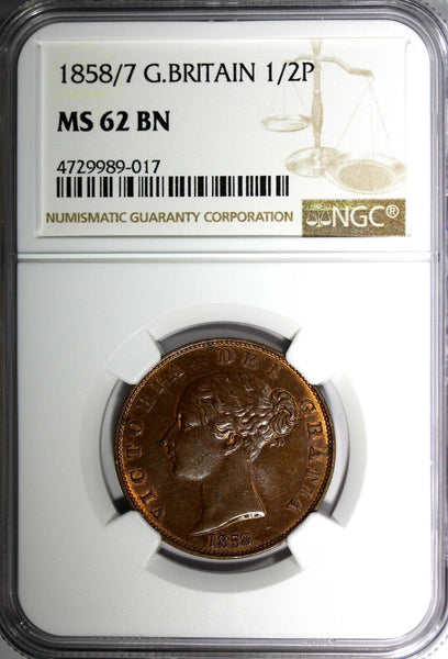 Great Britain Victoria (1837-1901) Copper 1858/7 1/2 Penny OVERDATE GRADED NGC MS62 BN KM# 726 Obverse : First uncrowned portrait ('Young Head') of Queen Victoria left, legend around, date below. Reverse : Seated figure of Britannia right, with trident in left hand and shield bearing the Union flag in right, legend around and national flower emblems in exergue. Please check out my other listings and we will be happy to combine in one package ! YOU WILL RECEIVED THE SAME COIN AS PICTURED. ALL COINS ARE AUTHENTIC AS DESCRIBED.