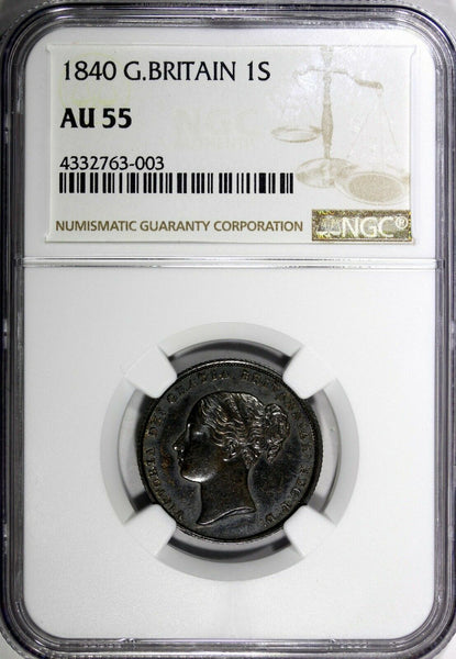 Great Britain Victoria Silver 1840 1 Shilling NGC AU55 Deep Toned KM# 734.1