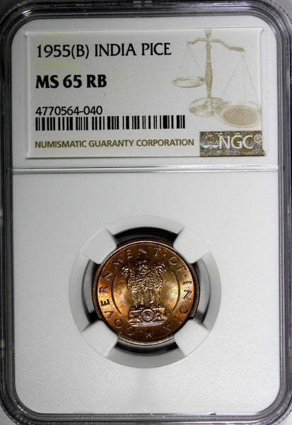 India-Republic Bronze 1955 (B) Pice NGC MS65 RB TOP GRADED BY NGC KM# 1.4