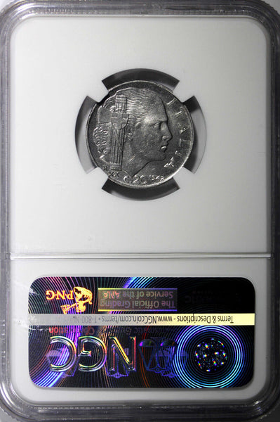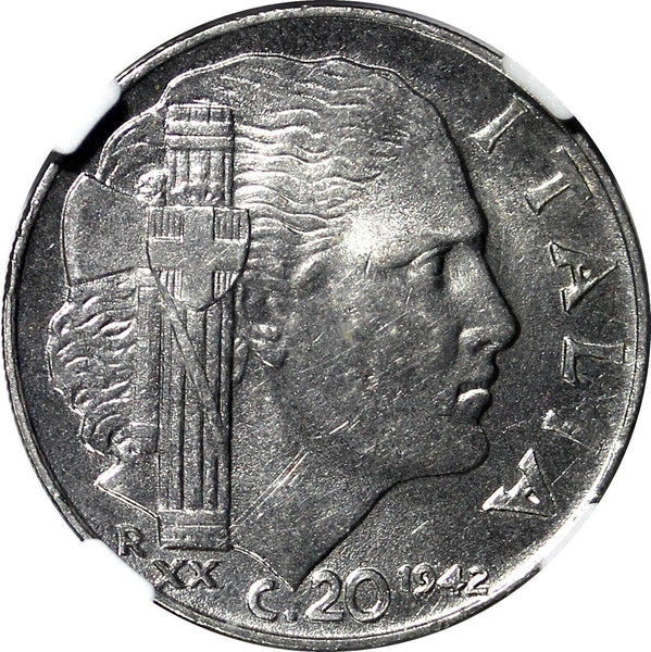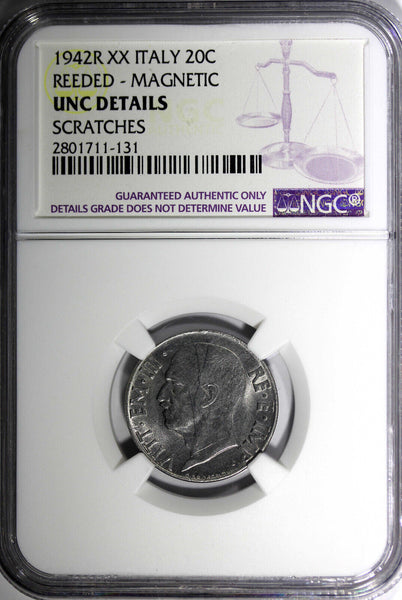 Italy 1942 R XX 20 Centesimi NGC UNC DETAILS MAGNETIC REEDED EDGE KM# 75b (131)