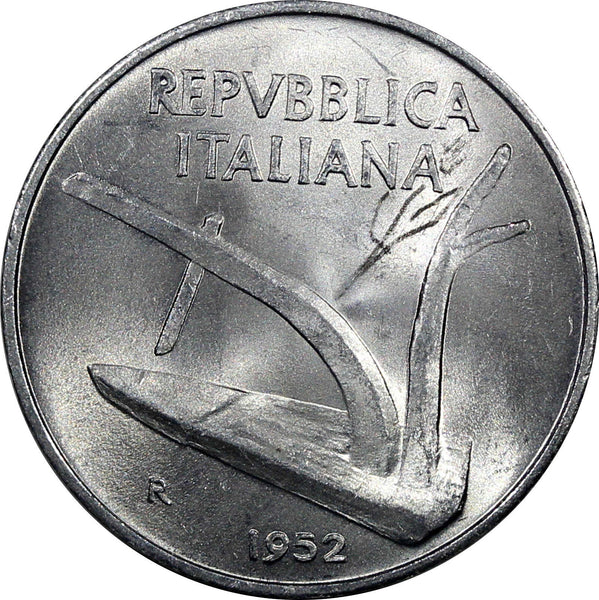 Italy Aluminum 1952-R 10 Lire UNC Condition Better Date KM# 93 Obverse: Plow Reverse: Value within wheat ears Edge Description: Plain YOU WILL RECEIVED THE SAME COIN AS PICTURED. ALL COINS ARE AUTHENTIC AS DESCRIBED. 9896