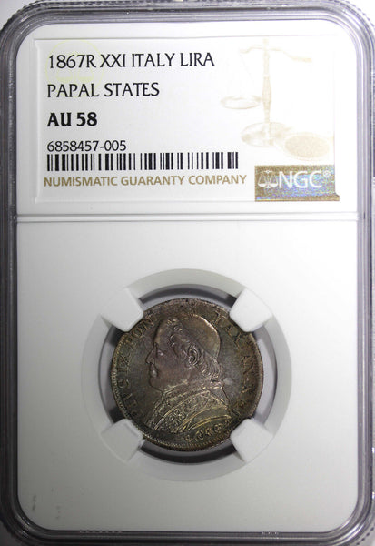 Italy PAPAL STATES Pius IX Silver 1867 XXI R 1 Lira NGC AU58 Toned KM# 1378 (5)