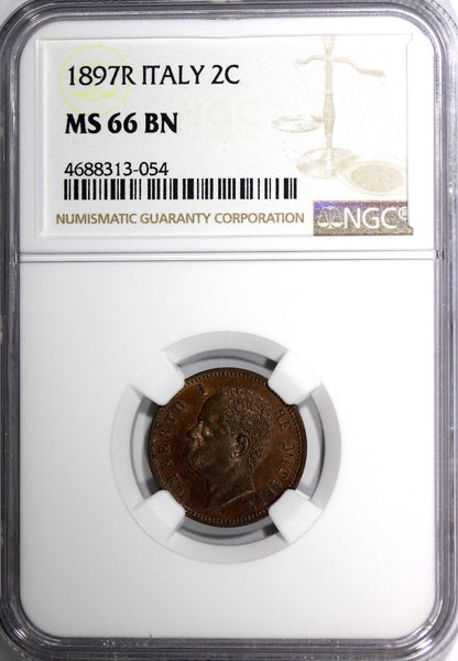 ITALY Umberto I COPPER 1897-R 2 Centesimi GRADED NGC MS66 BN TOP GRADED COIN BY NGC KM# 30 Obverse: Head left Obverse Legend: UMBERTO I RE D'ITALIA Reverse: Value, date within wreath Please check out my other listings and we will be happy to combine in one package ! YOU WILL RECEIVED THE SAME COIN AS PICTURED. ALL COINS ARE AUTHENTIC AS DESCRIBED.