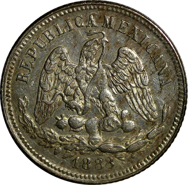 Mexico SECOND REPUBLIC Silver 1888 Mo M 25 Centavos Low Mintage-192,000 .Mexico City Mint KM# 406.7 Obverse: Eagle on cactus with snake in beak Reverse: Radiant cap with LIBERTAD inscribed above scales LEY on paper between scales Please check out my other listings and we will be happy to combine in one package ! YOU WILL RECEIVED THE SAME COIN AS PICTURED. ALL COINS ARE AUTHENTIC AS DESCRIBED. 14 374
