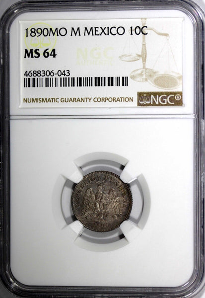 Mexico SECOND REPUBLIC Silver 1890 MO M 10 Centavos GRADED NGC MS64 NICE TONED Mexico City Mint KM# 403.7 Obverse: Facing eagle, snake in beak Obverse Legend: REPUBLICA MEXICANA Reverse: Value within 1/2 wreath Please check out my other listings and we will be happy to combine in one package ! YOU WILL RECEIVED THE SAME COIN AS PICTURED. ALL COINS ARE AUTHENTIC AS DESCRIBED.