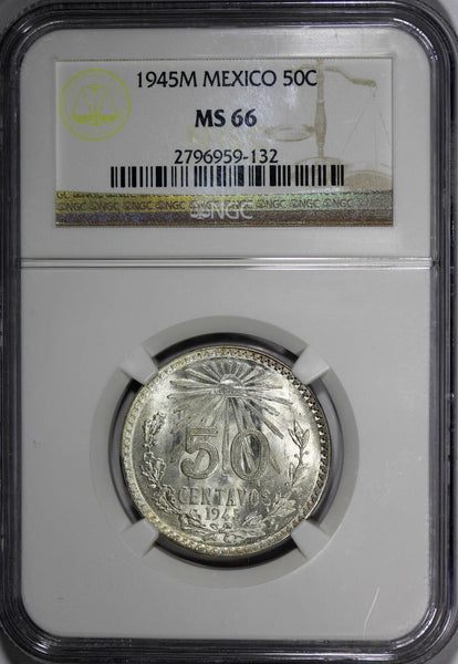 Mexico Silver 1945 M 50 Centavos GRADED NGC MS66 High Grade Only One Coin Graded Higher KM# 447 Obverse: National arms Reverse: Value and date within 3/4 wreath with Liberty cap above Edge Lettering: INDEPENDENCIA Y LIBERTAD YOU WILL RECEIVED THE SAME COIN AS PICTURED. ALL COINS ARE AUTHENTIC AS DESCRIBED.