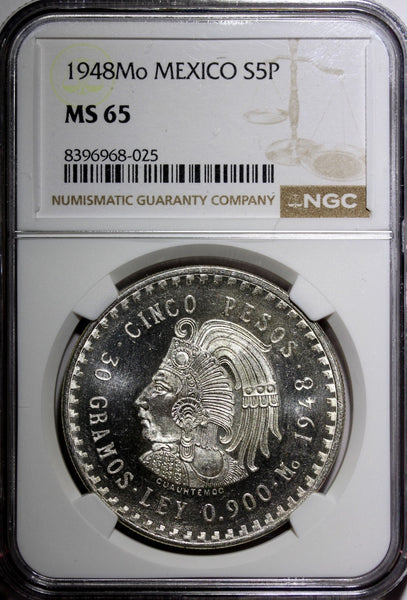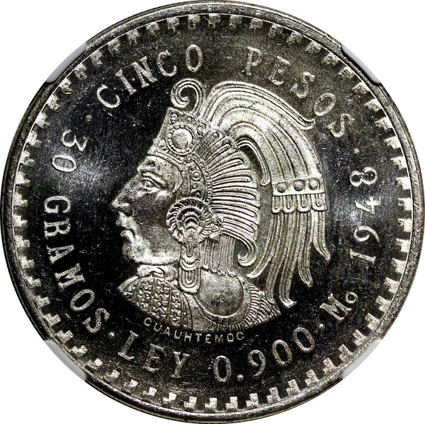 MEXICO Silver 1948 Mo 5 Pesos NGC MS65 Cuauhtemoc 40mm Mint Luster KM# 465 (025)
