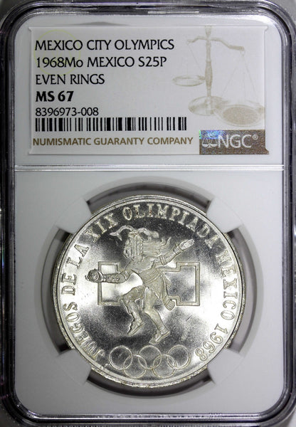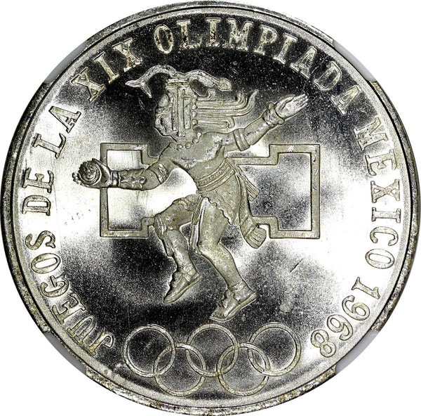 Reverse: The Olympic rings beneath an Aztec ball player facing left with the