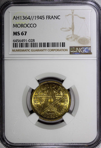 Morocco Mohammed V 1364 (1945) 1 Franc Paris Mint NGC MS67 TOP GRADED Y# 41 (8)