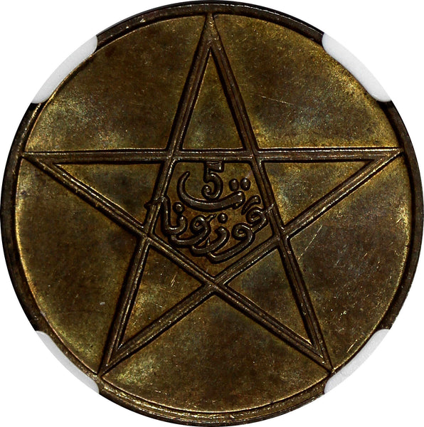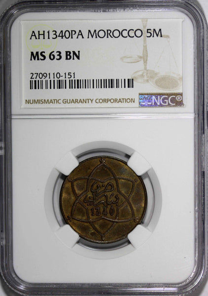 Morocco Yusuf Bronze AH1340 (1921) PA 5 Mazunas GRADED NGC MS63 BN PARIS MINT Y# 28.1 Obverse: Value within star Reverse: Mint name and date within doubled tri-lobe star YOU WILL RECEIVED THE SAME COIN AS PICTURED. ALL COINS ARE AUTHENTIC AS DESCRIBED.