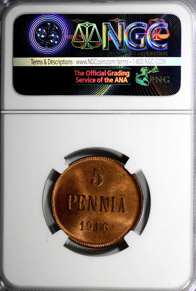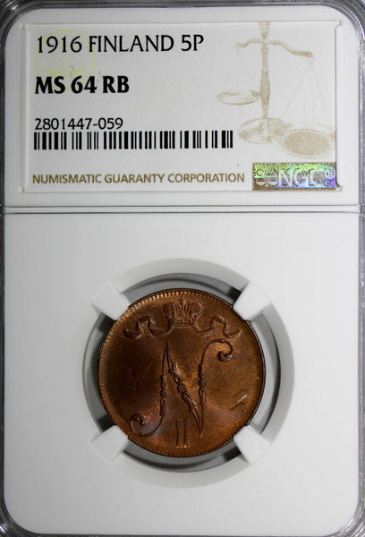 Finland Russian Tsar Nicolas II (1895-1917) 1916 5 Pennia GRADED NGC MS64 RB Diameter 25 mm KM# 15 Obverse: Crowned monogram Reverse: Denomination and date YOU WILL RECEIVED THE SAME COIN AS PICTURED. ALL COINS ARE AUTHENTIC AS DESCRIBED.