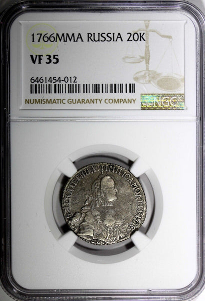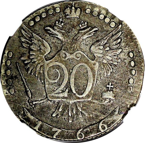 Russia Catherine II Silver 1766 MMD 20 Kopecks Moscow Mint NGC VF35 C#63a.1 RARE
