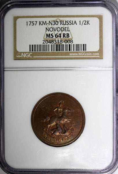 RUSSIA Elizabeth Copper 1757 Denga 1/2 Kopeck NOVODEL GRADED NGC MS64 RB VERY RARE Bitkin-502 (R2) KM# N30 OLD NGC SLAB .RECOMMENDED FOR UPGRADE Please check out my other listings and we will be happy to combine in one package ! YOU WILL RECEIVED THE SAME COIN AS PICTURED. ALL COINS ARE AUTHENTIC AS DESCRIBED.