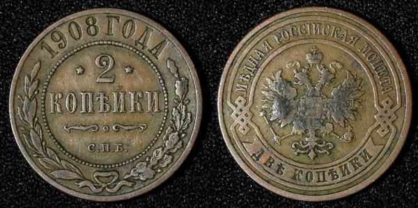 Russia Nicholas II Copper 1908 SPB 2 Kopecks St. Petersburg Mint Y# 10.2 (694)