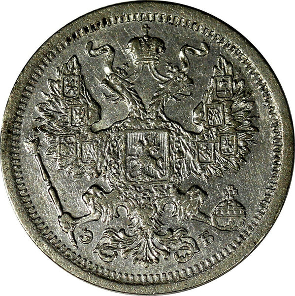 RUSSIA Nicholas II Silver 1907 SPB EB 20 Kopeks XF Y# 22a.1