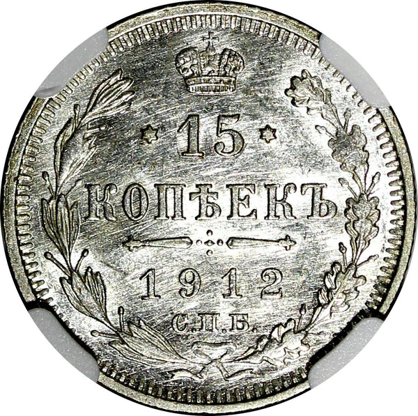 RUSSIA Nicholas II Silver 1912 SPB EB 15 Kopeks GRADED NGC MS63 HIGH GRADE GEM Y# 21a.2 Obverse: Crowned double-headed imperial eagle, ribbons on crown Reverse: Crown above date and value within wreath Edge Description: Reeded Please check out my other listings and we will be happy to combine in one package ! YOU WILL RECEIVED THE SAME COIN AS PICTURED. ALL COINS ARE AUTHENTIC AS DESCRIBED.